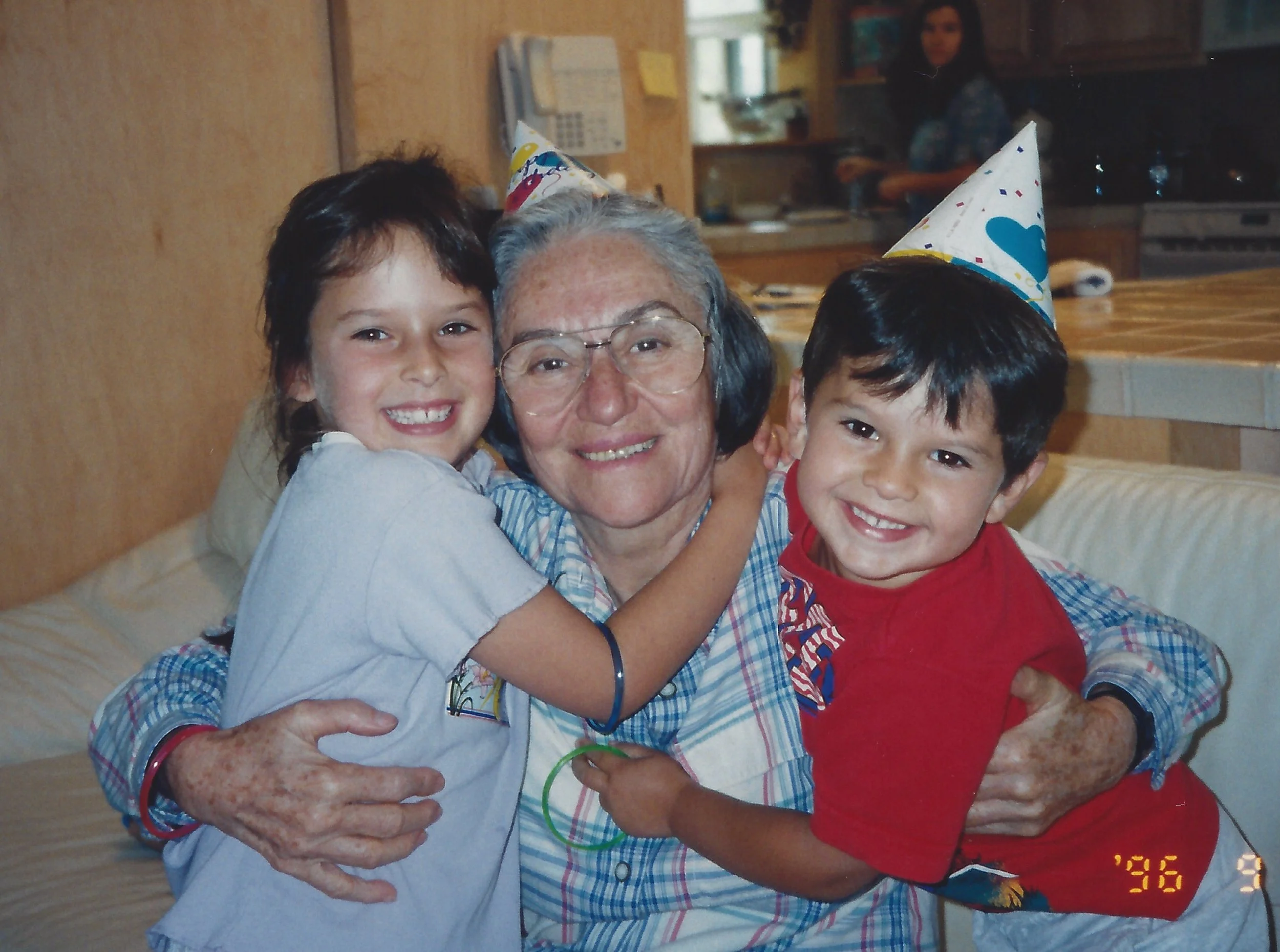 Edith on her 68th birthday with grandchildren Marea and Jeff