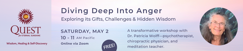 Please join us for this free one-hour workshop with Dr. Patricia Wolff—psychotherapist, chiropractic and homeopathic physician, and meditation teacher—where we will focus on learning how to pause, listen, and uncover the wisdom hidden within our anger, rather than pushing it away or being overtaken by it.